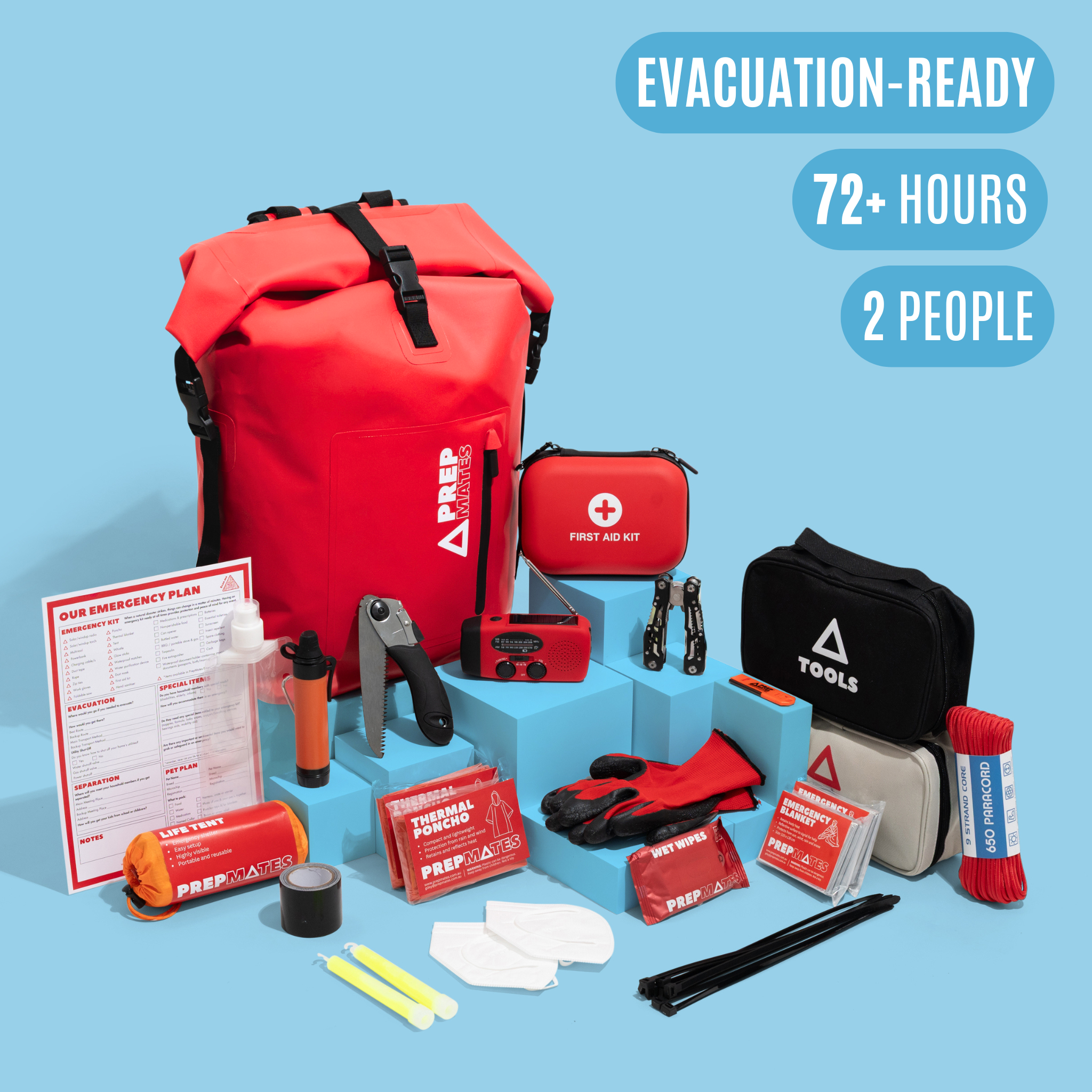 This 2 person emergency kit is designed to keep two adults safe and supported when a natural disaster strikes, with 140 essential survival supplies for shelter, power, water, communication, warmth and first aid, all packed in a durable waterproof backpack.