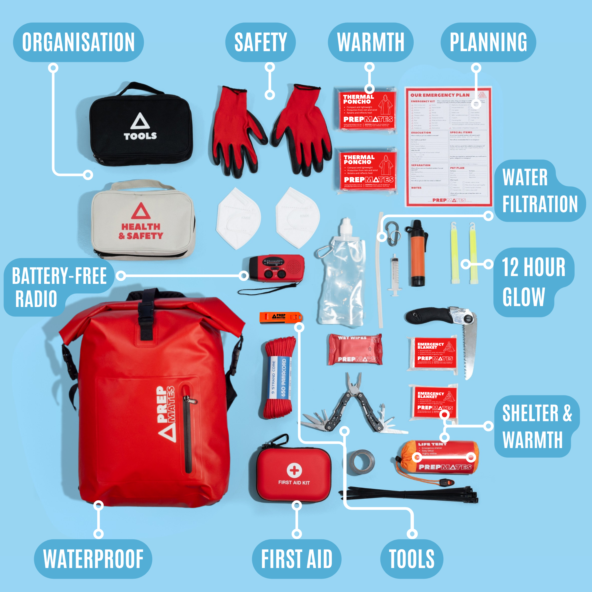 Be ready for bushfires, floods, blackouts or cyclones with our ready-made 2-person emergency kit. Designed right here in Australia with everything you need to stay safe, warm, connected and prepared for at least 72 hours.