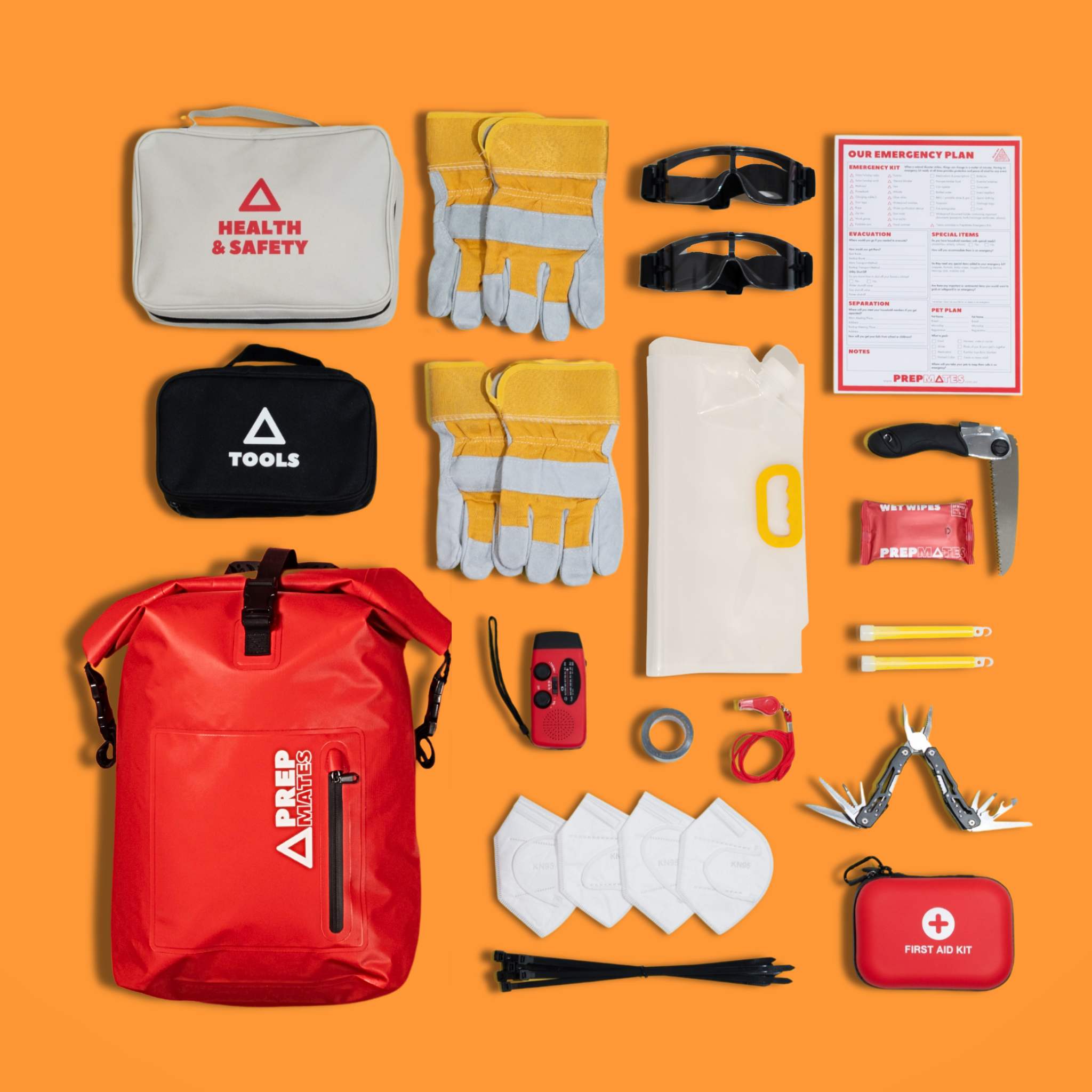Not sure what to pack? We've included a handy Emergency Checklist & Plan in every kit to give you some pointers. If you have kids, pets, or any special needs, make sure you have everything you need on hand to evacuate quickly if needed!