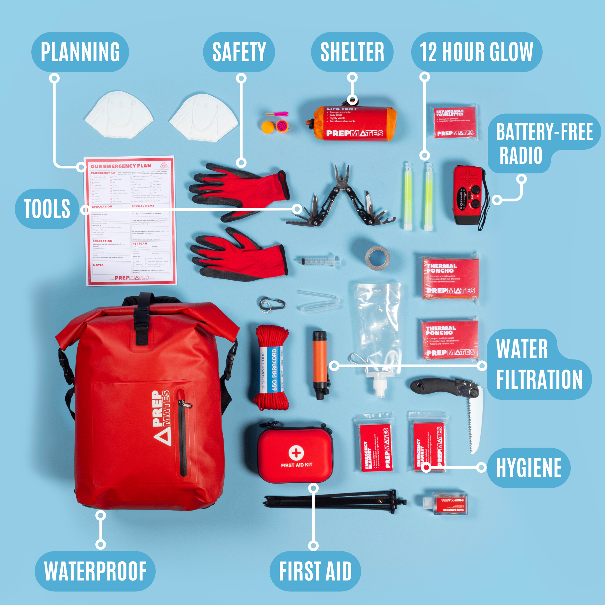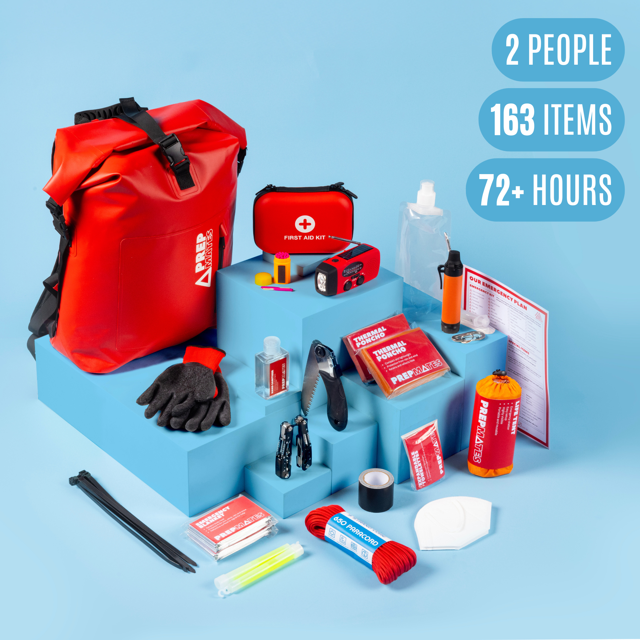 This 2 person emergency kit is designed to keep two adults safe and supported when a natural disaster strikes, with over 160 essential survival supplies for shelter, power, water, communication, warmth and first aid, all packed in a durable waterproof backpack.