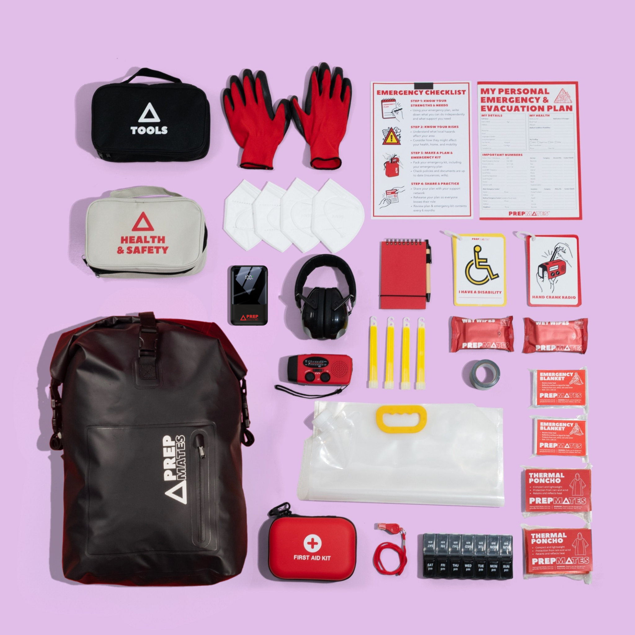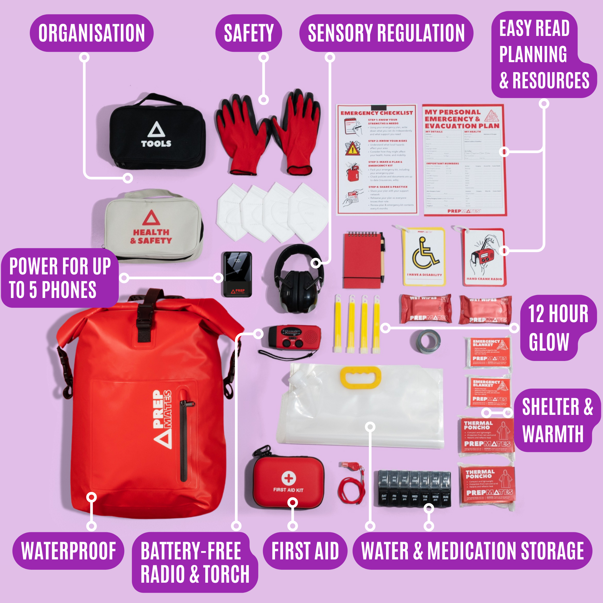 It includes all the essential items from our Essential Care Kit, plus additional support items such as sensory regulation earmuffs, all packed into a 30L waterproof backpack and compartmentalised carry bags so you can keep health supplies, safety items, and tools organised. This makes it faster and safer to leave home in an emergency.